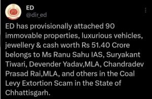 साथ ही आईएएस अधिकारी रानू साहू की संपत्ति को भी अटैच करने का भी उल्लेख किय गया है। साथ ही कोराबारी सूर्यकांत तिवारी की प्रापर्ती को भी अटैच करने का ट्वीटर में जिक्र किया गया है। केंद्रीय प्रवर्तन निदेशालय द्वारा किए गए ट्वीट में बकायदा फोटो भी शेयर किया गया है। इसमें चार फोटो है। इस फोटो में खाली जमीन दिख रही है, जिसे बड़े प्रापर्टी माना जा रहा है। साथ ही शॉपिंग कॉम्प्लेक्स के साथ ही बड़े आलीशान बंगले की फोटो भी साझा की गई है। तो वहीं ज्वेलरी की फोटो को भी शेयर किया गया है।