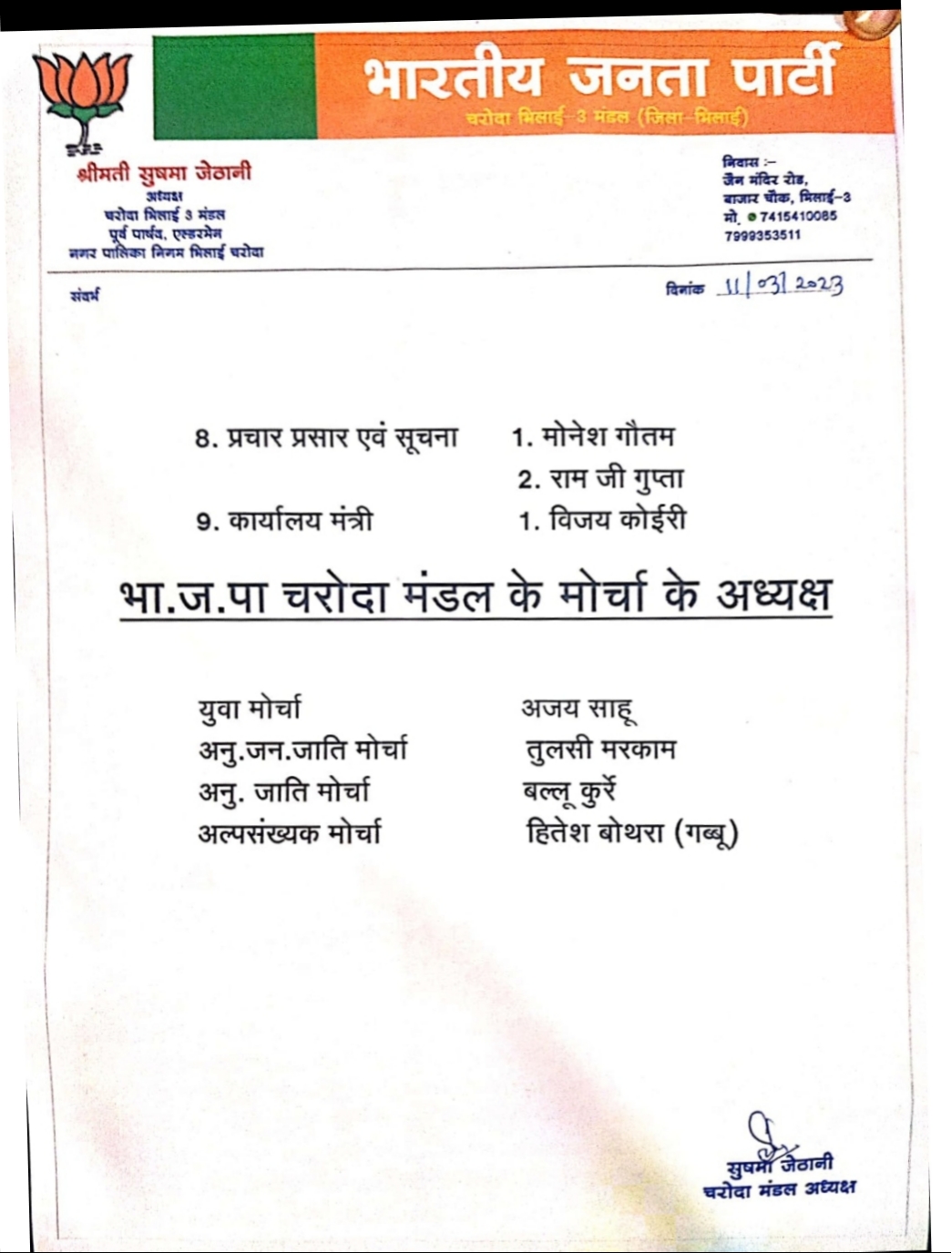 : भिलाई चरौदा मंडल की कार्यकारणी बीजेपी की चरौदा मंडल अध्यक्ष सुष्मा जेठानी ने की जारी मुकेश अग्रवाल महामंत्री, श्याम सुन्दर जायसवाल महामंत्री, देखे किसे मिली जिमेदारी………