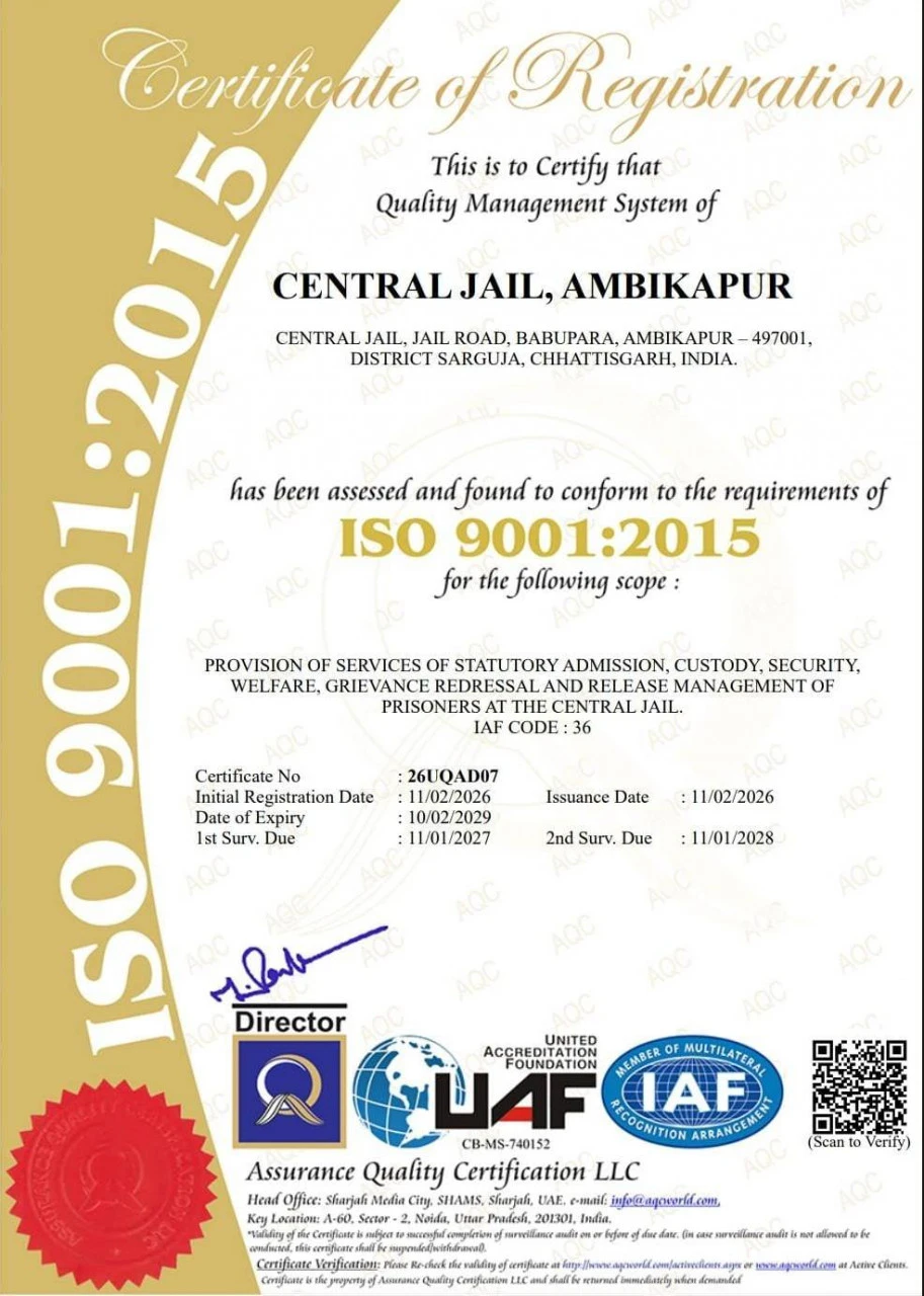 छत्तीसगढ़ की जेल व्यवस्थाओं में गुणवत्ता, पारदर्शिता और जवाबदेही को सुदृढ़ करने की दिशा में एक महत्वपूर्ण उपलब्धि हासिल हुई है। उप मुख्यमंत्री एवं जेल विभाग के प्रभारी मंत्री विजय शर्मा के निर्देशन में राज्य की जेलों की व्यवस्थाओं को बेहतर बनाने के लिए लगातार प्रयास किए जा रहे है। इन्हीं प्रयासों का ही यह परिणाम है कि छत्तीसगढ़ की सेंट्रल जेल रायपुर, दुर्ग, बिलासपुर एवं अम्बिकापुर को अंतरराष्ट्रीय गुणवत्ता मानक आईएसओ 9001ः2015 का प्रमाणन प्राप्त हुआ है।