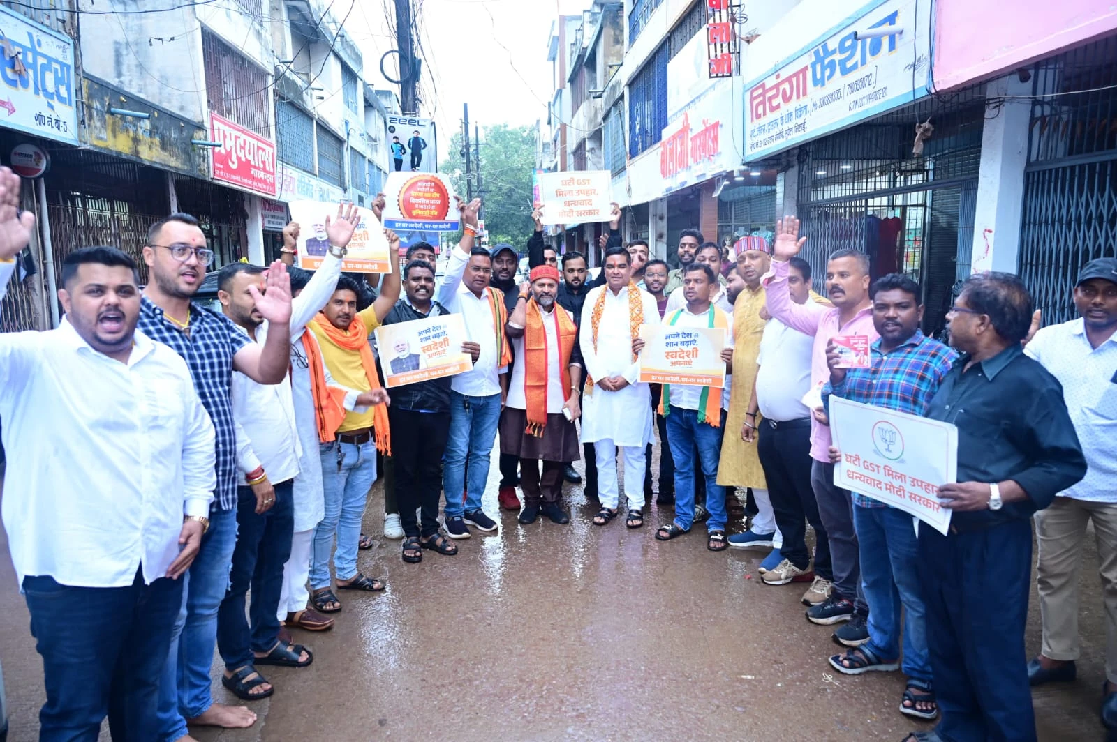 स्वदेशी स्लोगन बोर्ड और स्टीकर बांटे, कहा - नेक्स्ट जेन जीएसटी से खिले : बरसते पानी में विधायक रिकेश पहुंचे गणेश मार्केट सुपेला, हर व्यापारी को गुलाब भेंट कर दी बधाई