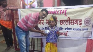 संस्कार भारती की दुर्ग जिला इकाई द्वारा हुडको उडिया बस्ती के हनुमान मंदिर में श्रीकृष्ण जन्माष्टमी के कार्यक्रम में 1वर्ष से लेकर 5 वर्ष तक के बच्चों को कृष्ण , राधा , बलराम रूप सज्जा का कार्यक्रम किया गया जिसमें माताओ ने अपने बच्चों को बाल कृष्ण , राधा के वेश में सुंदर रूप में प्रस्तुत किया कार्यक्रम में नवीन पंडित , मनोज यादव , विकास पांडे , राजेश धारकर , हेमंत सगदेव तथा बस्ती के अनेक लोग उपस्थित थे बस्ती के लोगों का विशेष सहयोग रहा