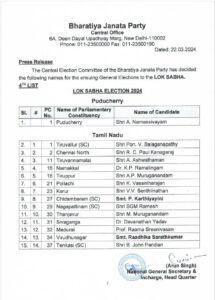 BJP 4th Candidates Lists: लोकसभा चुनाव 2024 के लिए बीजेपी ने अपने उम्मीदवारों की एक और लिस्ट जारी कर दी है। इस लिस्ट में तमिलनाडु और पुडुचेरी के उम्मीदवारों की घोषणा की गई है। बीजेपी की इस लिस्ट में कुल 15 उम्मीदवारों के नाम हैं। इनमें से तमिलनाडु के लिए 14 नामों का एलान किया गया है।