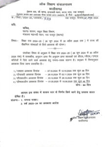 प्रस्ताव के अनुसार, स्कूलों में दशहरा के अवसर पर 7 अक्टूबर से 12 अक्टूबर तक 6 दिनों की छुट्टी रहेगी। इसके अलावा, दीपावली के अवसर पर 28 अक्टूबर से 2 नवंबर तक 6 दिनों की छुट्टी रहेगी। शीतकालीन अवकाश 23 दिसंबर से 28 दिसंबर तक 6 दिनों का होगा, जबकि ग्रीष्माकालीन अवकाश 1 मई से 15 जून तक कुल 46 दिनों का प्रस्तावित है।