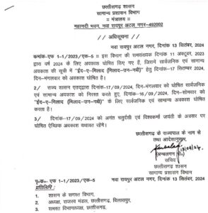 सामान्य प्रशासन विभाग द्वारा एक आदेश जारी किया गया है, जिसमें छुट्टी की तिथि में किए गए परिवर्तन के बारे में जानकारी दी गई है।