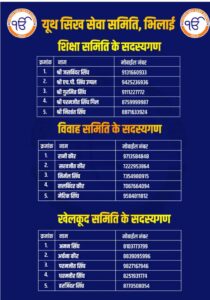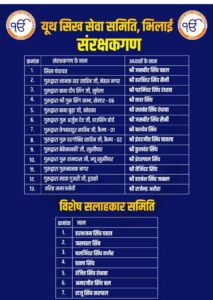 भिलाई नगर 25 अक्टूबर । यूथ सिख सेवा समिति के अध्यक्ष सरदार इंद्रजीत सिंग छोटू के द्वारा कार्यकारिणी की घोषणा की गई है। संरक्षक में कुल 13 वरिष्ठ जनों को स्थान दिया गया है। जिसमें सिख पंचायत गुरुद्वारा एवं समाजसेवी को शामिल किया गया है। विशेष सलाहकार समिति में कुल 7 लोगों को स्थान दिया गया है। इसके अलावा शिक्षा समिति, विवाह समिति एवं खेलकूद समिति का भी गठन किया है। जबकि कार्यकारिणी में 21 सदस्यों को स्थान दिया गया है।