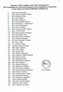 छत्तीसगढ़ में दूसरे फेज के लिए बीजेपी के स्टार प्रचारकों की सूची जारी, पीएम मोदी, राजनाथ समेत ये दिग्गज नेता भरेंगे हुंकार