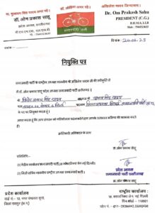 समाजवादी पार्टी ने भी छत्तीसगढ़ विधानसभा चुनाव की तैयारी की शुरू, मंतोष यादव के करीबी विनोद यादव बने सपा भिलाई जिलाध्यक्ष