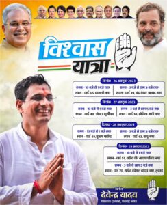 विधायक बनने के पहले महापौर के कार्यकाल से विधायक देवेंद्र यादव लगातार भिलाई की भलाई और जनता की सेवा में लगे हैं। इस 5 साल के विश्वास, इस 5 साल के रिश्ते को और मजबूत करने के लिए अब विधायक श्री यादव 25 अक्टूबर शाम 5 बजे हनुमान मंदिर सेक्टर 9 से विश्वास यात्रा की शुरूआत कर रहे है। विधायक श्री यादव ने इसके यात्रा के संबंध में बताते हुए कहा कि 5 साल उन्होंने जनता की सेवा। इस सेवा के बीच जनता से जो प्रेम संबंध, जो अटूट रिश्ता बना है। इस रिश्ते को और मजबूत करने के लिए वे यात्रा कर रहे हैं। आप को बता दे कि इससे पहले विधायक देवेंद्र यादव ने भिलाई संकल्प यात्रा निकाली। फिर आमजन के साथ वार्ड के बैठकर चाय पर चर्चा की। इसके बाद कोरोना काल आया। तब भी विधायक देवेंद्र यादव लोगों से ऑॅनलाइन माध्यम से जुड़े रहे और ऑनलाइन संवाद किए। लोगों की मदद की। इसके बाद हर वार्ड के हर गली मोहल्ले में चौपाल लगाकर भेंट मुलाकात किया गया। तब विधायक देवेंद्र यादव खुद हर घर तक पहुंचे और लोगों से मिले। इन सब के बाद अब प्रगति यात्रा की शुरूआत करने वाले है। 19 अगस्त से 251 किलोमीटर की प्रगति यात्रा की थी। इसके बाद अब विश्वास यात्रा शुरू कर रहे हैं।