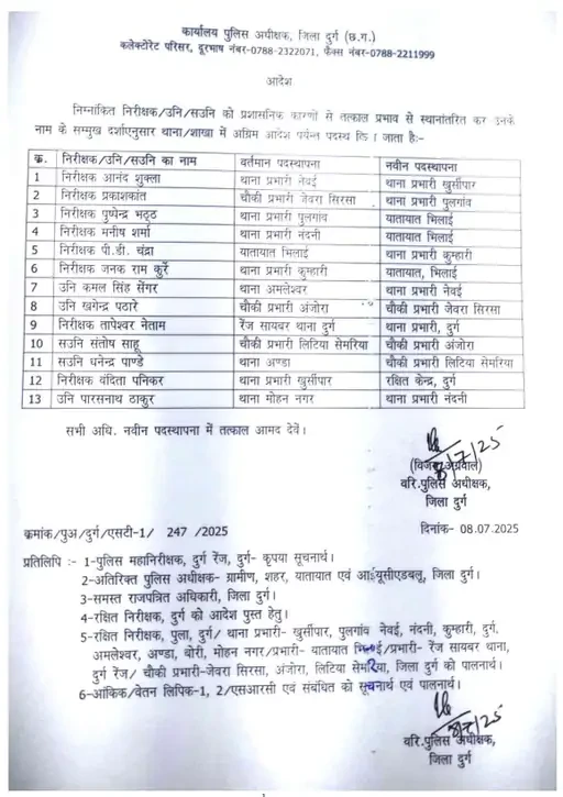 दुर्ग : दुर्ग जिले के 13 इंस्पेक्टरों का तबादला किया गया हैं। : ब्रेकिंग न्यूज़ : दुर्ग जिले के 13 इंस्पेक्टरों का तबादला किया गया