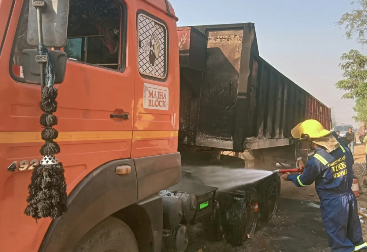 नैशल हाइवे में चलते हुए ट्रक पर अचानक आग लगने से : आग की सूचना मिलते ही अग्निशमन के दमकल टीमों को मौके पर तत्काल रवाना किया गया,